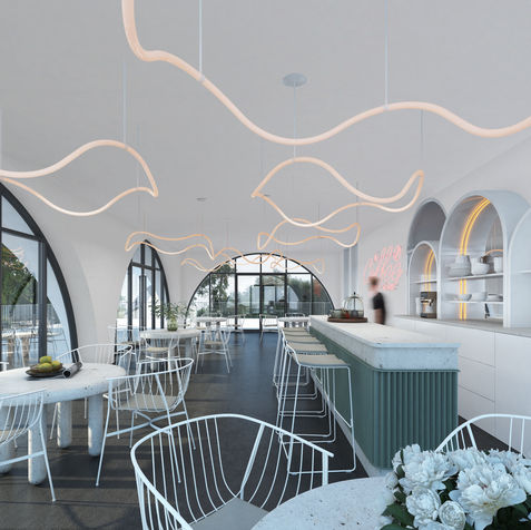 V přízemí jsme pracovali s obloukovými okny, jednoduše vsazenými do fasády, která evokují městská loubí. V jejich skrytu se nachází též kavárna s venkovním posezením, odkud je díky umístění opět krásný výhled na město. Místo by mělo sloužit nejen rezidentům, ale i veřejnosti.
