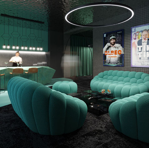 Na podlahy jsme použili černý koberec, aby se prostor co nejvíce zminimalizoval a utlumil - nechal vyniknout hru odrazů, zrcadlení na stropě a v konečném důsledku ponechal prostor samotným divákům. Naopak výrazný akcent mají bar a šatna, vystupující na výrazné měděno-zlaté stěrce z černého základu. Intuitivně přitahují pozornost a fungují pro diváky jako pevné orientační body.